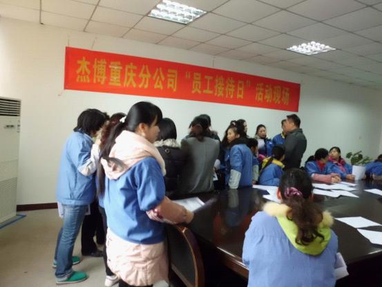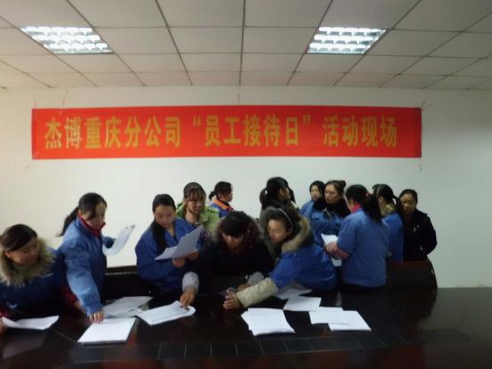 為更好的傾聽員工心聲,切實幫助員工解決工作上存在的困惑、生活上遇到的問題,本著“關(guān)心工作、關(guān)心生活、關(guān)心成長”的杰博服務(wù)文化,“為客戶服務(wù)的心,永無止境;為員工服務(wù)的心,永無止境”的服務(wù)宗旨, 致力于成為中國人力資源服務(wù)行業(yè)“員工服務(wù)效率”和“員工滿意度”最高的人力資源服務(wù)機(jī)構(gòu)的服務(wù)目標(biāo),2011年12月23日我司聯(lián)合客戶單位舉辦了杰博重慶分公司“員工接待日”活動。