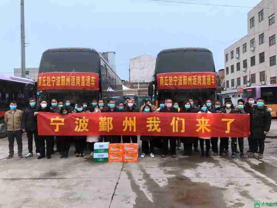 2月28日,五輛載著務(wù)工人員的返工專車從河南商丘始發(fā),將驅(qū)馳近900公里,開往浙江省寧波市鄞州區(qū),前往他們的第二故鄉(xiāng),投入到2020年的復(fù)產(chǎn)復(fù)工之中。